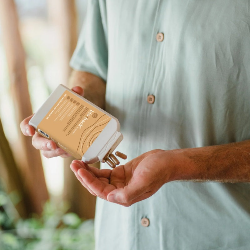 Biohack® is our exclusive adaptogen formula, a powerful combination of organic mushrooms such as Maitake, Reishi, Shiitake, Lion's Mane, Chaga, along with astragalus root, acerola fruit and black pepper. This blend provides key nutrients such as vitamin C and vegan vitamin D, which are not found in other plants, all in a comfortable capsule designed to support your well-being.