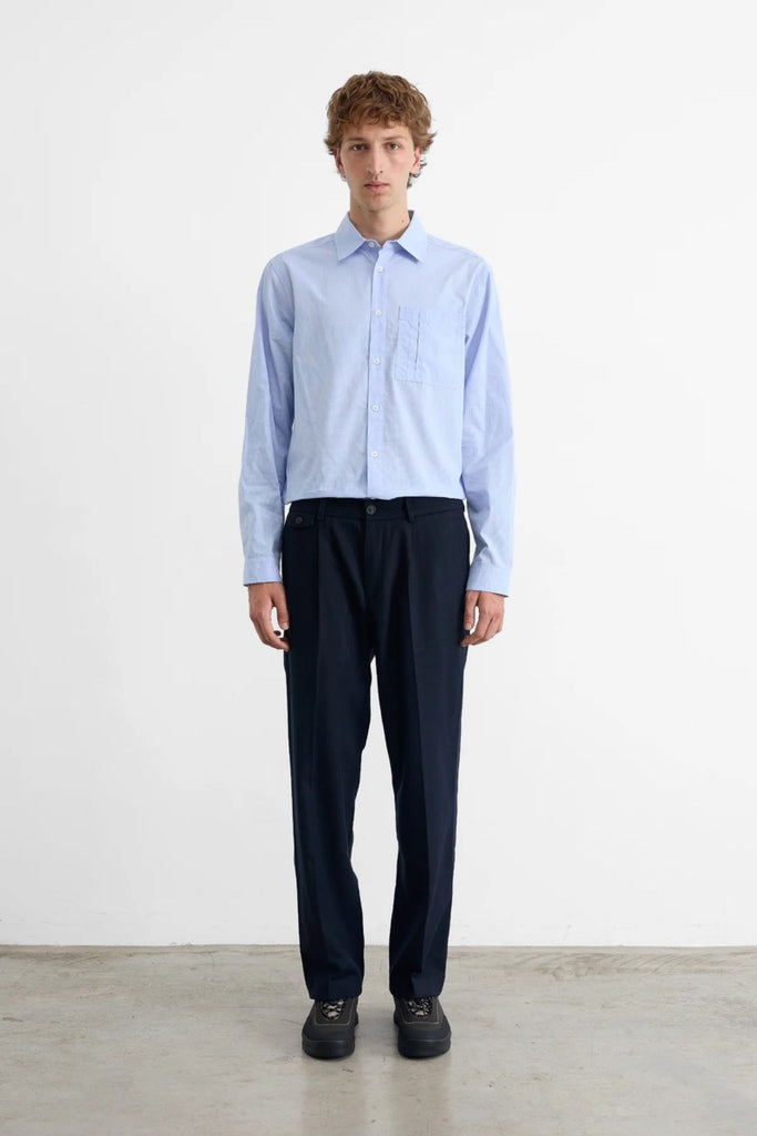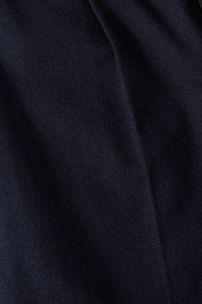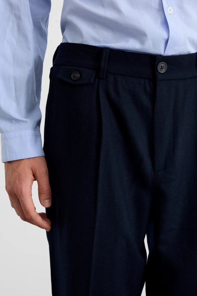 Pantalón azul marino de mezcla de lana con un look clásico. Confeccionado con 65 % lana y 29 % poliéster. La cinturilla trasera tiene elástico para mayor comodidad. Corte holgado y bolsillo para el billetero. Hecho en Portugal.