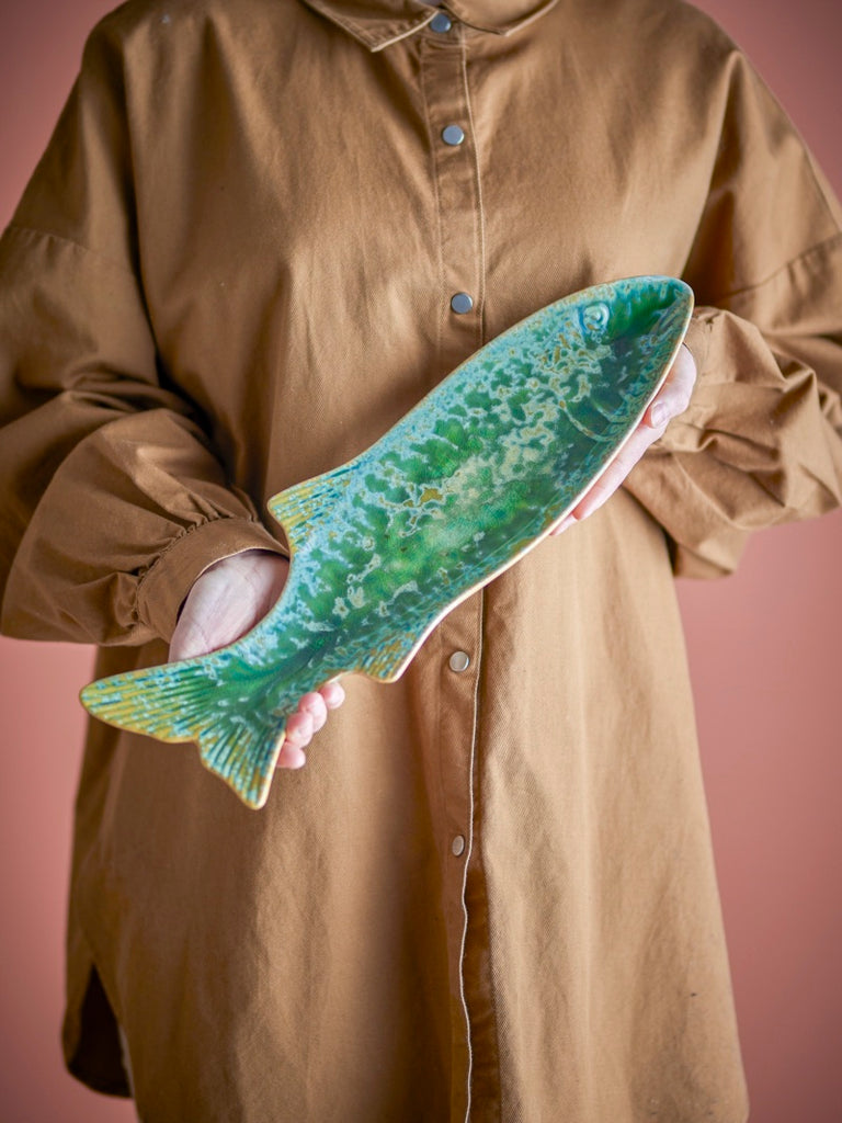 El plato Hadden de Creative Collection está hecho de gres y tiene forma de pez. Su esmalte reactivo verde crea sutiles variaciones de color, otorgando un aspecto único a cada pieza. Ideal para porciones pequeñas o como elemento decorativo.