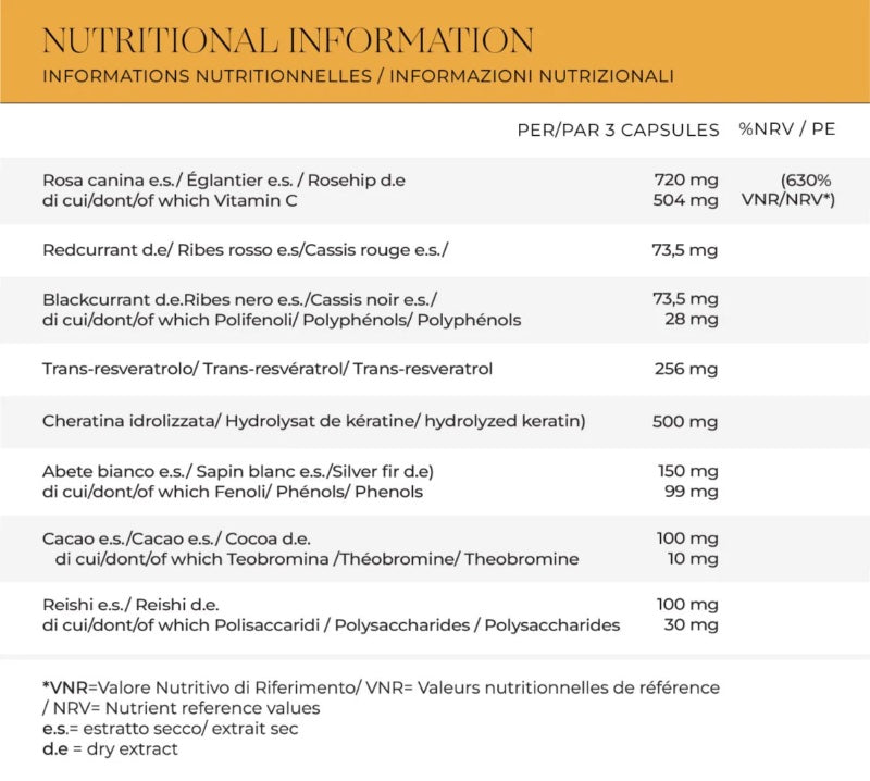 Each compound in this formula has been selected not in isolation, but for its functional synergy—supporting collagen architecture, microcirculation, antioxidant defense, and keratin structure at a cellular level.