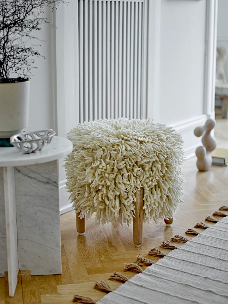 El taburete Lomba de Bloomingville está hecho de lana, en tono natural, con un diseño capitoné. Sus patas de madera clara contrastan con la lana. Su uso como elemento decorativo en el salón creará un ambiente cálido y le dará un toque elegante.